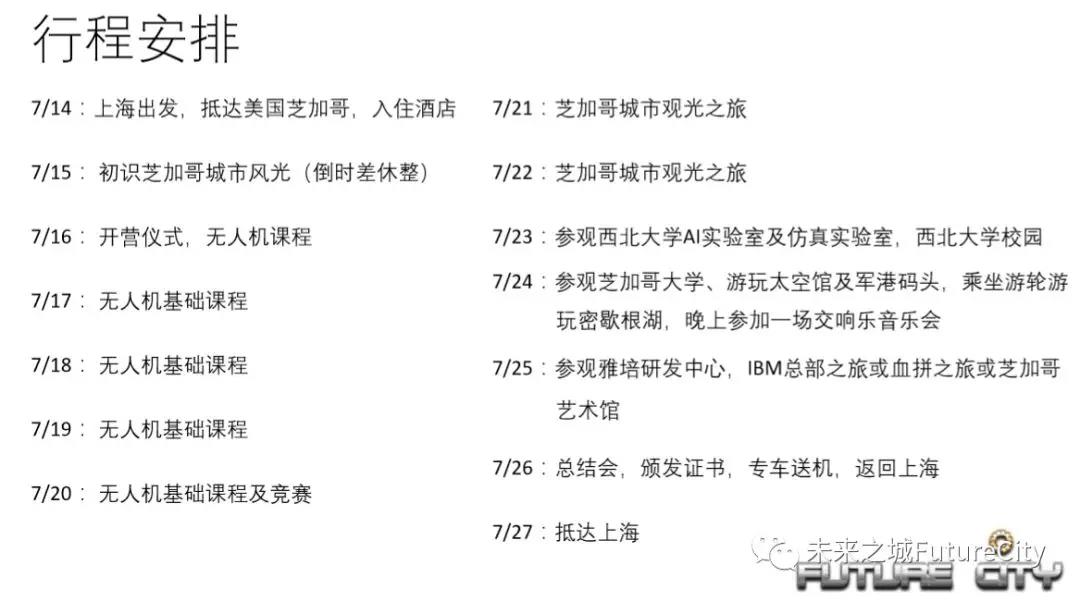 今年暑假,未来之城以项目模式将开展不一样的全新体验模式,在优秀师资的带领下,前往美国芝加哥接轨国际教育,去美国名城感受科教文化,去名校拓展视野,去名企培养动手能力,引入国际权威STEM教学工具,由学员亲自完成无人机制作,从而全面提升STEM素养。